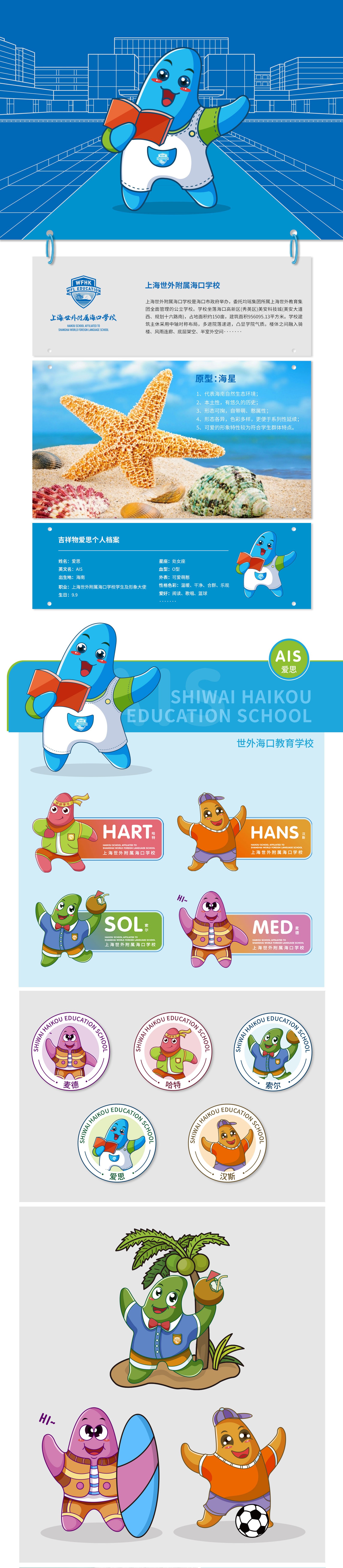 考慮到這所學校位處海口,地理位置優(yōu)越,環(huán)境優(yōu)美,景色宜人,同時作為學校及學生的宣傳大使,需要具備辨識度高、記憶點強的特點。基于此,石特在對吉祥物進行設計創(chuàng)作時,選取以海星為原型,其不僅能代表海南自然的生態(tài)環(huán)境,還具有本土性強,歷史悠久的特性;通過對學生群體性格特征及愛好的分析,擬化出自帶萌性的卡通形象,特征明顯極易辨認;吉祥物以系列化的形式進行呈現(xiàn),整體顏色明亮活潑,其中有熱愛唱歌的“麥穗”,認真學習的“哈特”,樂觀向上的“索爾”,喜歡閱讀的“愛思”以及愛足球運動“漢斯”,它們形態(tài)可掬,萌感十足,符合學生群體的特點。本次石特為上海世外附屬海口學校的吉祥物的成功策劃,得到了客戶的高度認可。