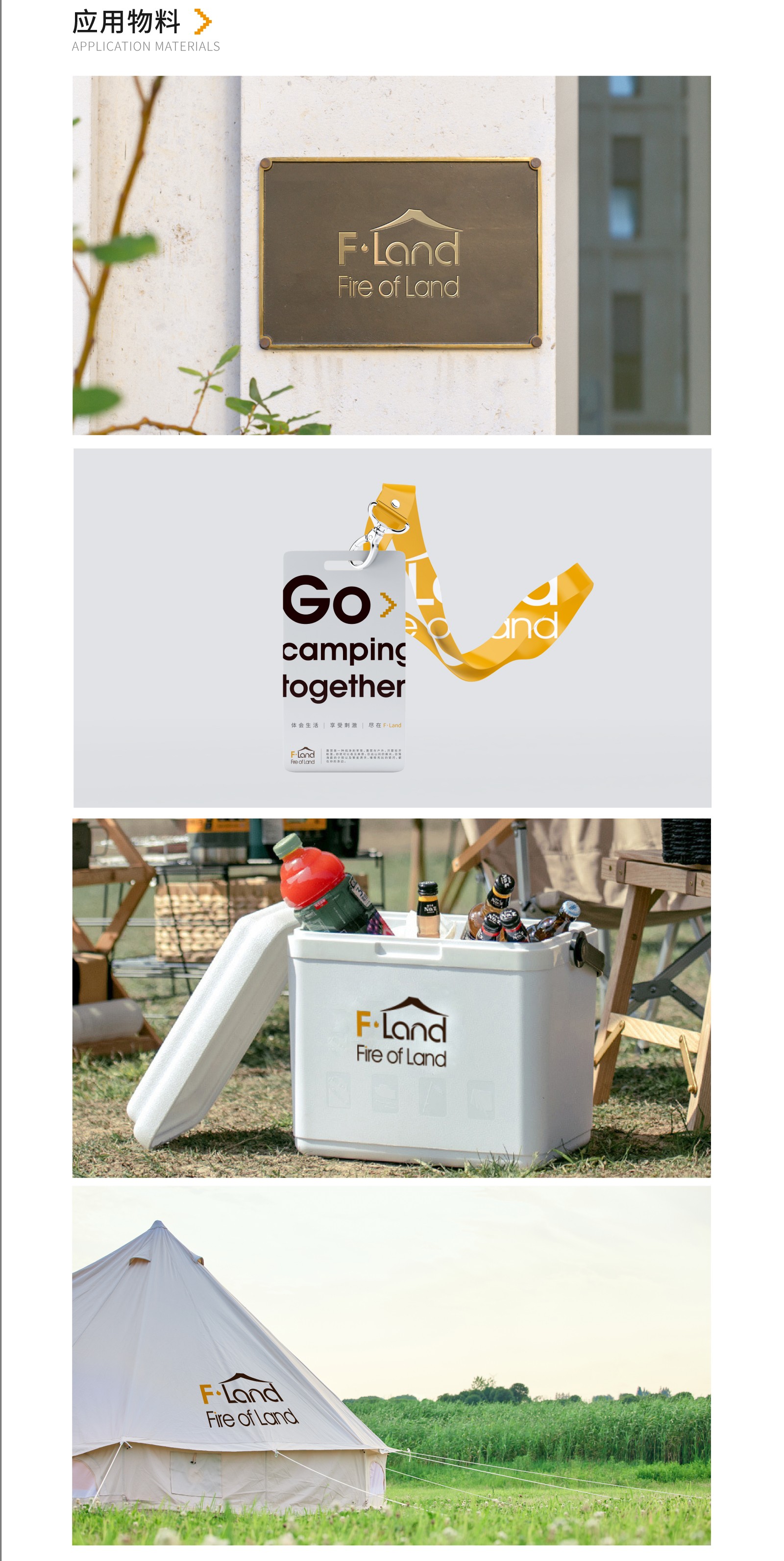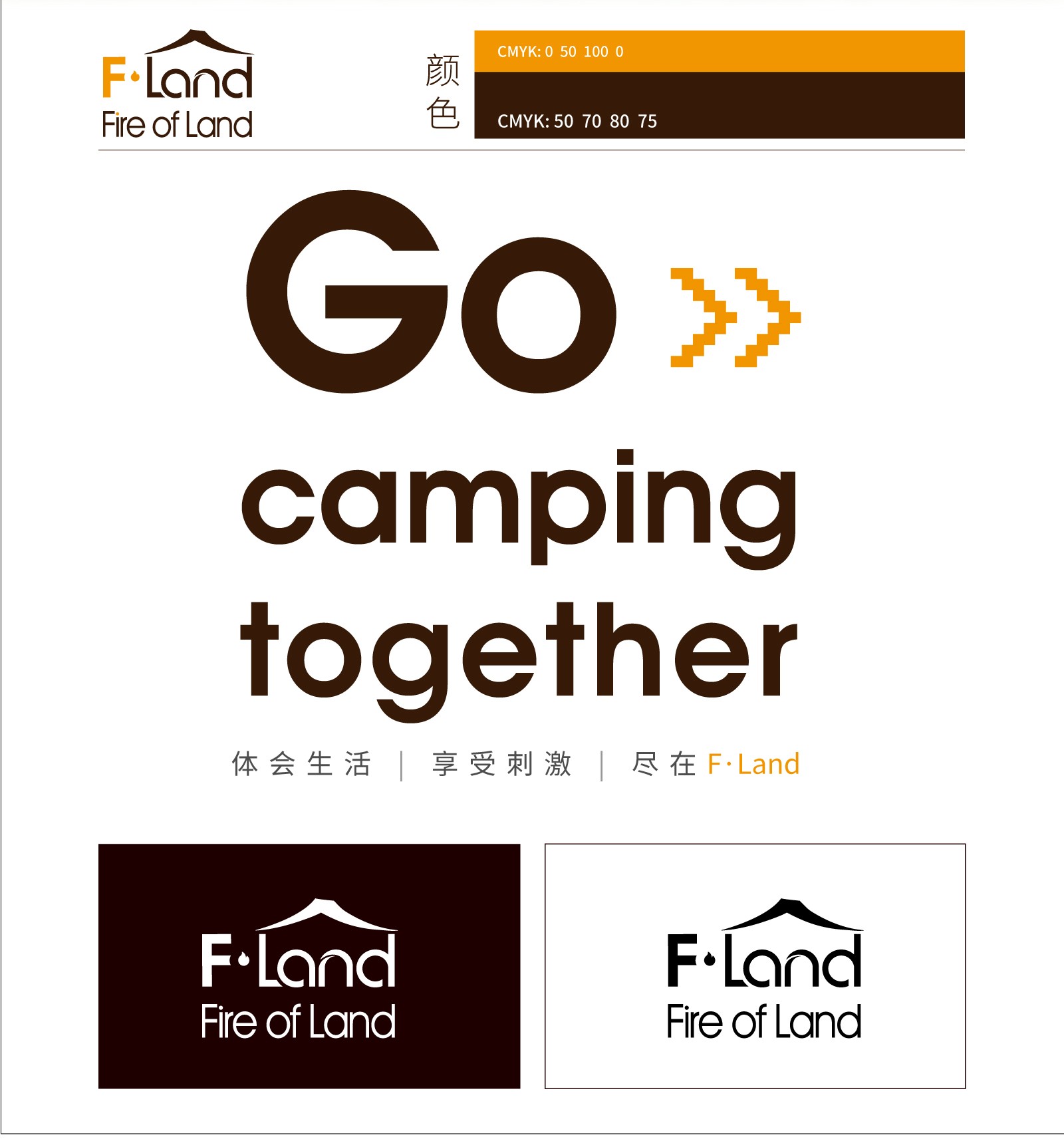 通過(guò)“F.Land"與戶(hù)外露營(yíng)帳篷的外形提取設(shè)計(jì),組合。元素中的“l(fā)and"中文意思為“陸地”,帳篷作為戶(hù)外露營(yíng)重要的工具,在英文“l(fā)and"上方加入帳篷元素,兩者巧妙結(jié)合,體現(xiàn)出了戶(hù)外露營(yíng)者在陸地上搭建帳篷的這一特點(diǎn),突出品牌的定位一戶(hù)外露營(yíng)。
