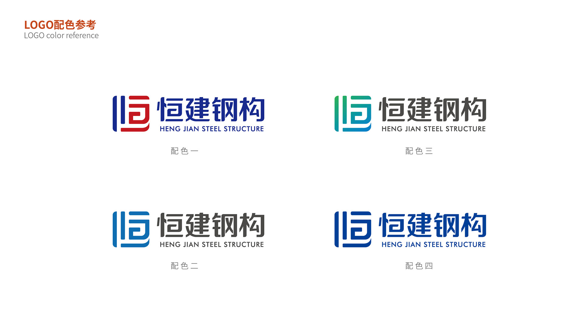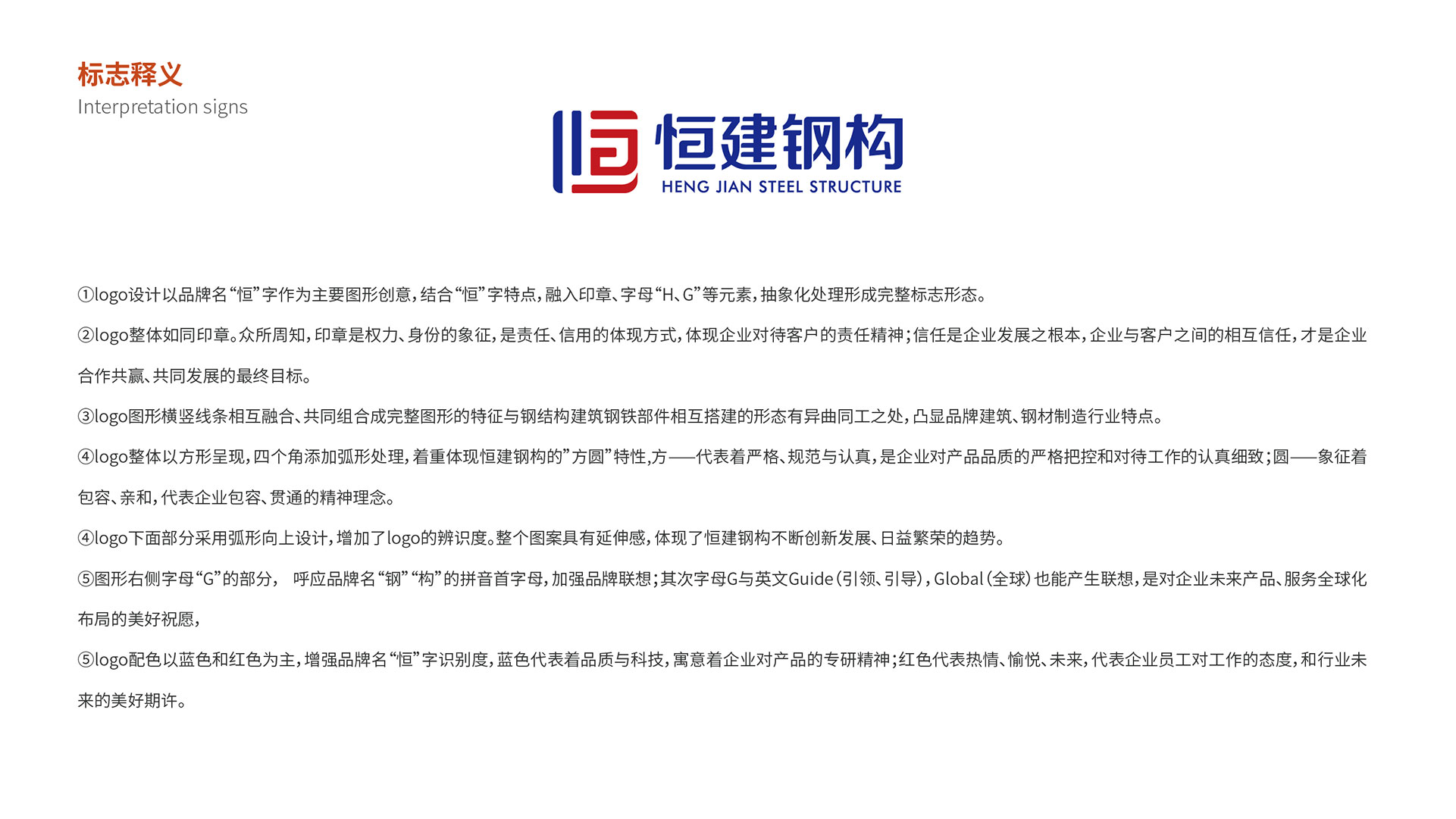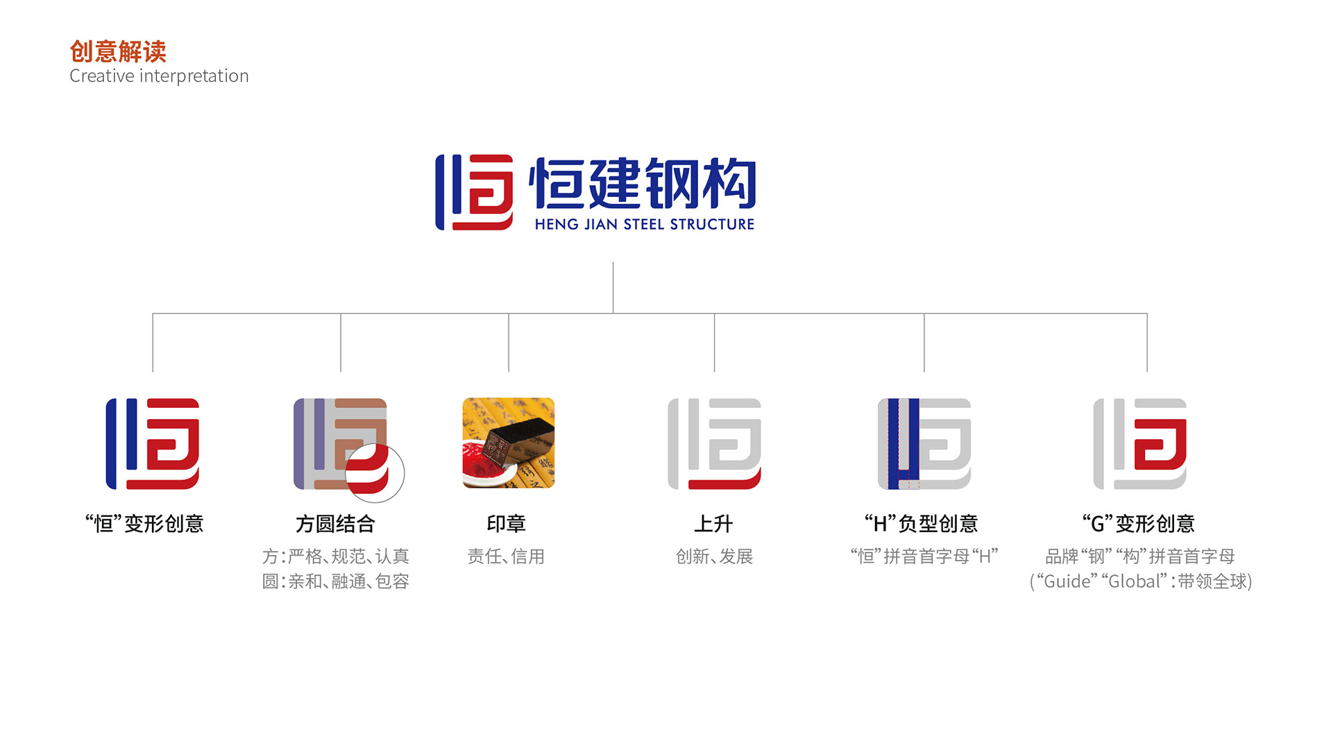 logo設計以品牌名“ 恒" 字作為主要圖形創(chuàng)意, 結(jié)合“ 恒” 字特點, 融入印章、字母"H 、G ” 等元素, 抽象化處理形成完整標志形態(tài)。 logo整體如同印章。眾所周知, 印章是權(quán)力、身份的象征, 是責任、信用的體現(xiàn)方式, 體現(xiàn)企業(yè)對待客戶的責任精神; 信任是企業(yè)發(fā)展之根本, 企業(yè)與客戶之間的相互信任, 才是企業(yè)合作共贏、共同發(fā)展的最終目標。 logo圖形橫豎線條相互融合、共同組合成完整圖形的特征與鋼結(jié)構(gòu)建筑鋼鐵部件相互搭建的形態(tài)有異曲同工之處, 凸顯品牌建筑、鋼材制造行業(yè)特點。 logo整體以方形呈現(xiàn), 四個角添加弧形處理, 著重體現(xiàn)恒建鋼構(gòu)的" 方圓" 特性, 方一一亻弋表著嚴格、規(guī)范與認真, 是企業(yè)對產(chǎn)品品質(zhì)的嚴格把控和對待工作的認真細致; 圓一. 一象征著包容、親和, 代表企業(yè)包容、貫通的精神理念。