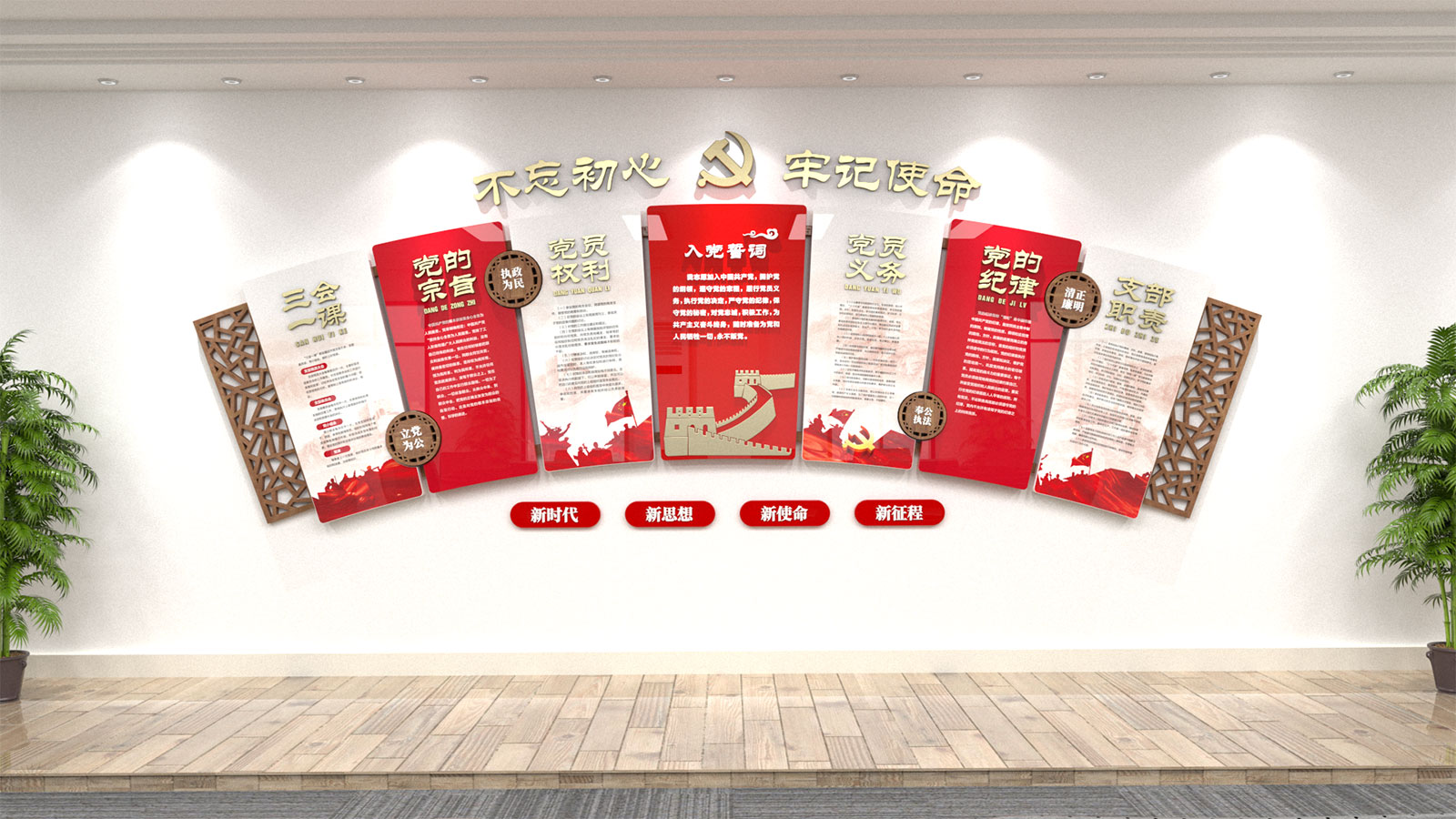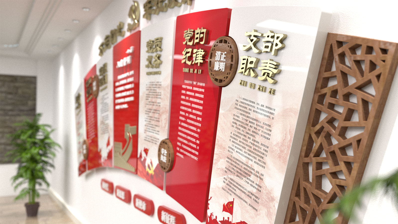 黨建文化墻適用于比較大的前廳,進行政務公開、黨務公開的政策宣傳地方使用。通過文化墻推廣宣傳,借墻接穩地氣,裝點了企業文化環境,進一步提升基層黨建的文化內涵,使廣大黨員職工在濃厚的文化氛圍中增長知識,提振精神,凝聚合力,堅定信心永遠跟黨走。