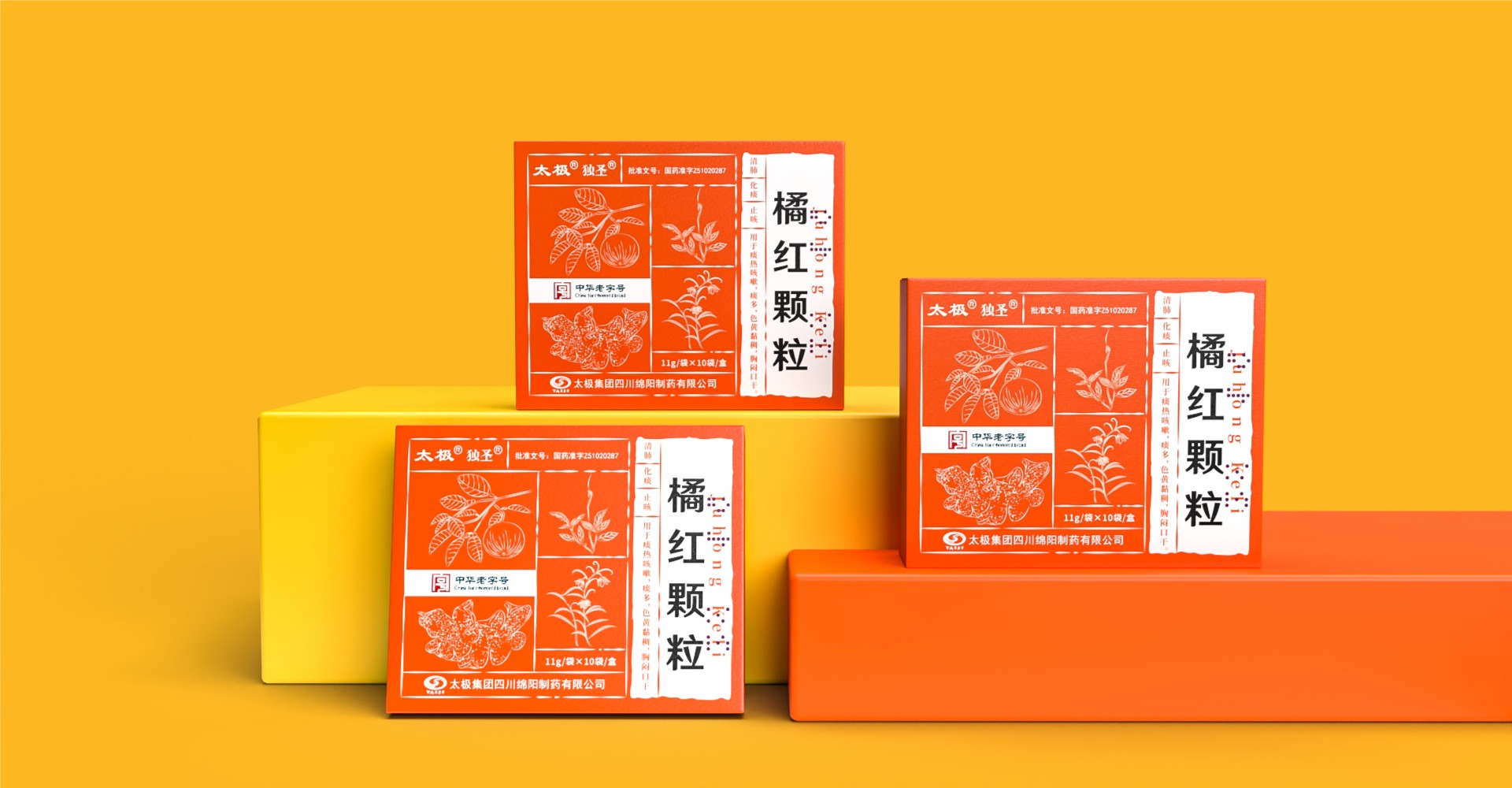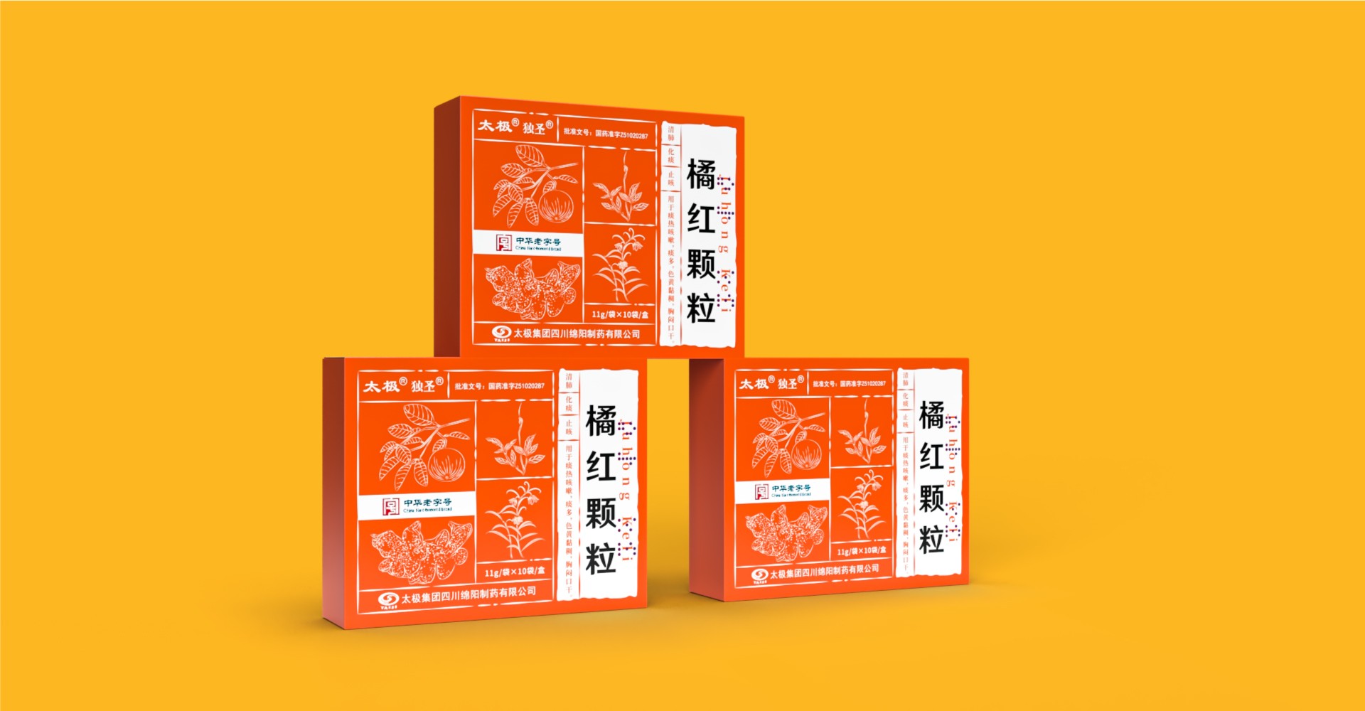 橘紅顆粒”作為中華老字號的中成藥,其包裝設計充分融合了傳統與現代元素,既展現了藥品的深厚文化底蘊,又體現了現代審美觀念。在色彩選擇上,包裝采用了鮮明的橙色背景,象征著活力與健康,同時也與中藥的溫暖屬性相契合。白色圖案和文字在橙色背景的映襯下更加醒目,使得包裝信息一目了然。