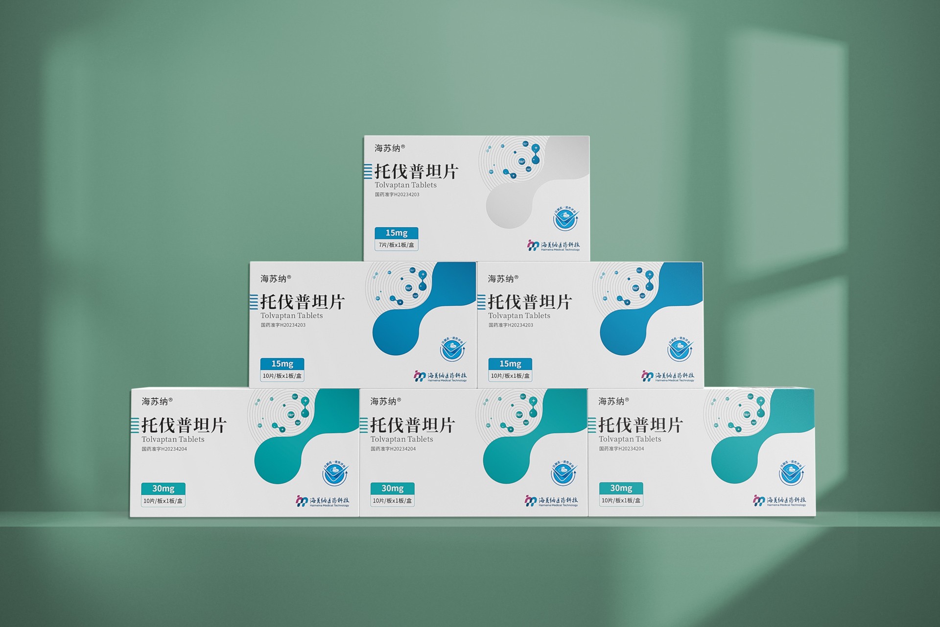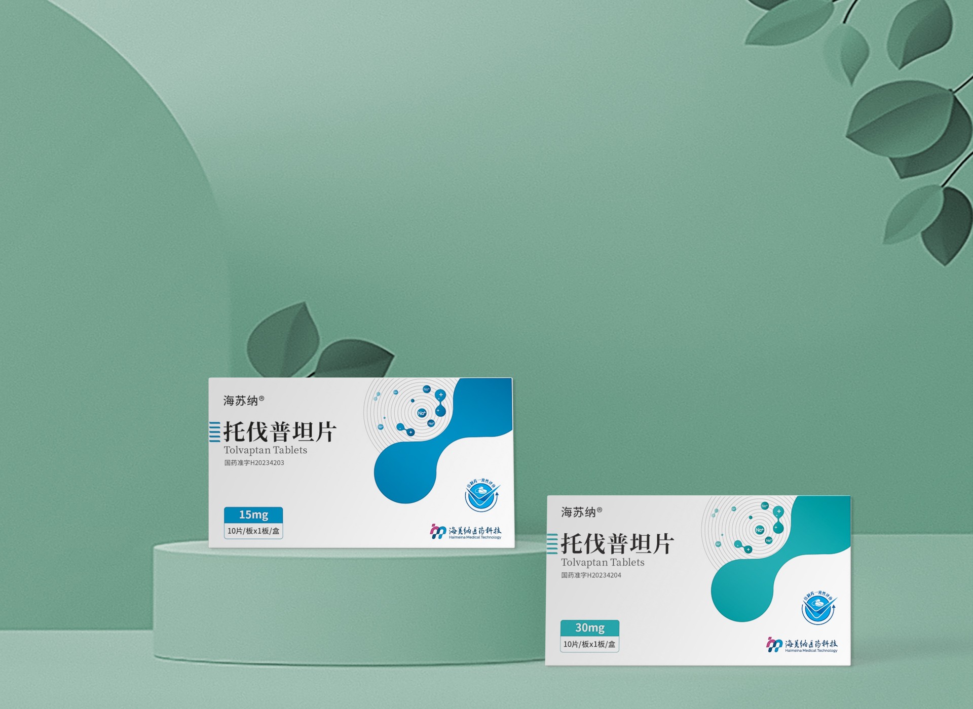 整個包裝盒以白色為主色調,展現出清新、純凈的視覺效果,符合醫療產品的專業形象。在盒子的設計上,巧妙地融入了綠色和藍色的設計元素,不僅為整體設計增添了活力,也與托伐普坦片的醫療屬性相呼應。 包裝盒的正面顯著位置印有“托伐普坦片”的中文和英文標識,字體清晰易讀,便于患者和醫護人員快速識別。同時,藥品的劑量“30mg”以及包裝規格“7片/板×1板/盒”等信息也得以明確標注,確?;颊吣軌驕蚀_了解和使用藥品。 包裝盒下方設計了一個淺綠色的圓形臺座,不僅為藥品提供了穩定的支撐,還增加了整體設計的層次感。背景墻采用淡綠色,并輔以垂直條紋裝飾,為整個包裝增添了現代感和時尚感。在包裝盒的背面或側面,應標注國藥準字、生產廠家、生產日期、有效期等詳細信息,確?;颊吣軌蛉媪私馑幤返南嚓P信息。 總的來說,托伐普坦片的藥品包裝設計既體現了醫療產品的專業性,又充分考慮了患者的使用體驗。通過簡約而不失設計感的外觀,以及清晰明了的文字信息,該藥品包裝能夠有效地幫助患者識別和使用藥品,提升了產品的整體品質和市場競爭力。