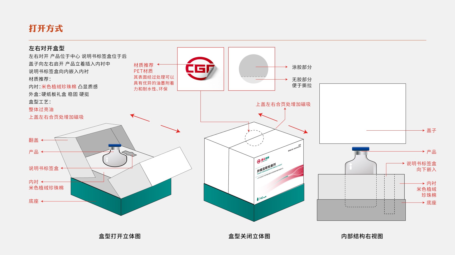 腫瘤溫敏栓塞劑作用于肝癌腫瘤患者,該醫療器械需取放便捷,我們采用雙開門的開口方式,開口處有磁吸與標貼,雙重防護,標貼并非全覆蓋粘貼,有涂膠與非涂膠部分,在保證產品安全的同時不失便捷。