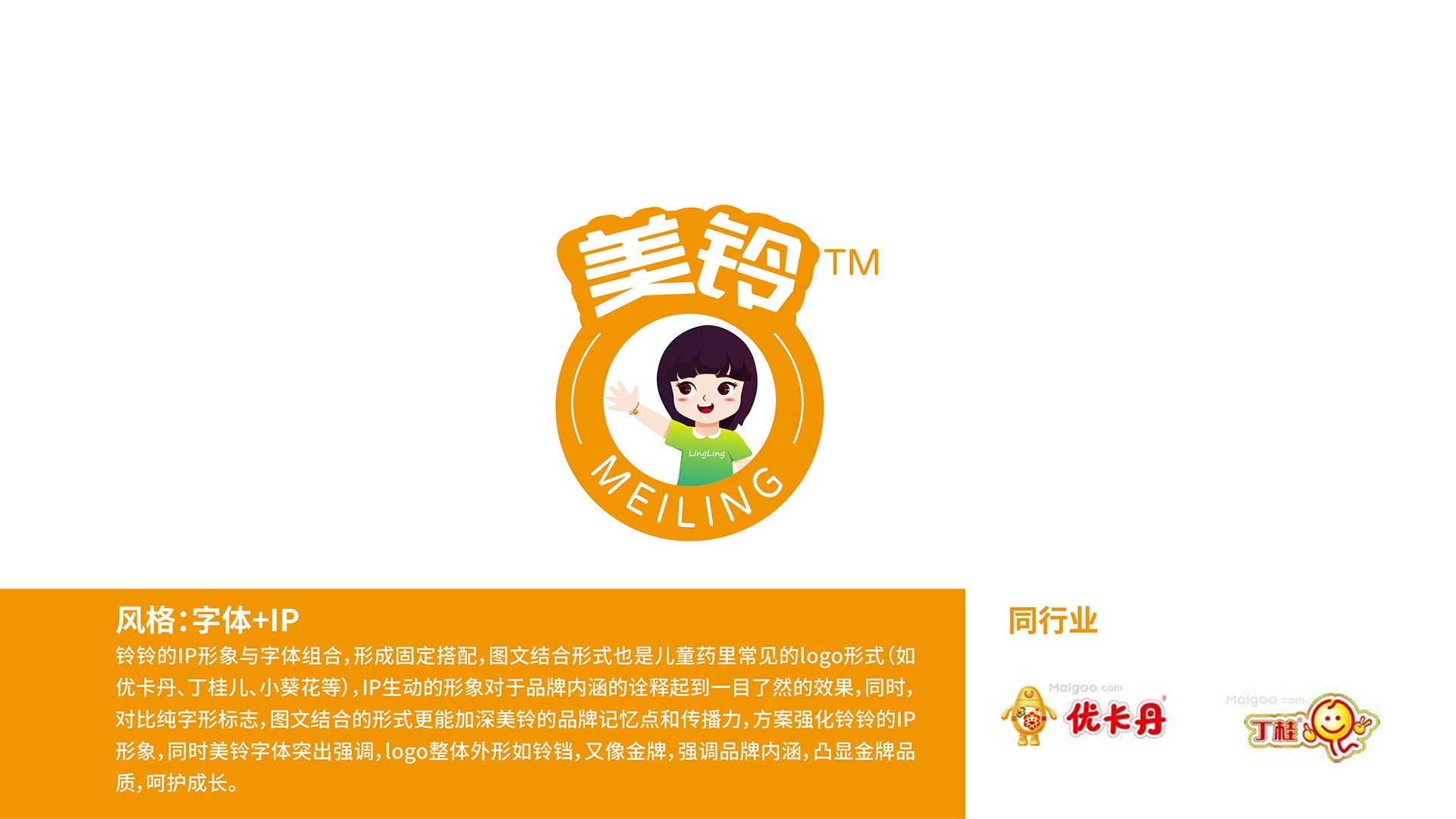 以字體+IP的形式設計美玲商標,形成固定搭配,圖文結合形式也是兒童藥里常見的logo形式(如優卡丹、丁桂兒、小葵花等),IP生動的形象詮釋品牌內涵;同時,對比純字形標志,圖文結合的形式更能加深美鈴的品牌記憶點和傳播力,方案強化鈴鈴的IP形象,同時美鈴字體突出強調,logo整體外形如鈴鐺,又像金牌,強調品牌內涵,凸顯金牌品質,呵護成長。奧吉娜IP延展(2)_頁面_2.jpg