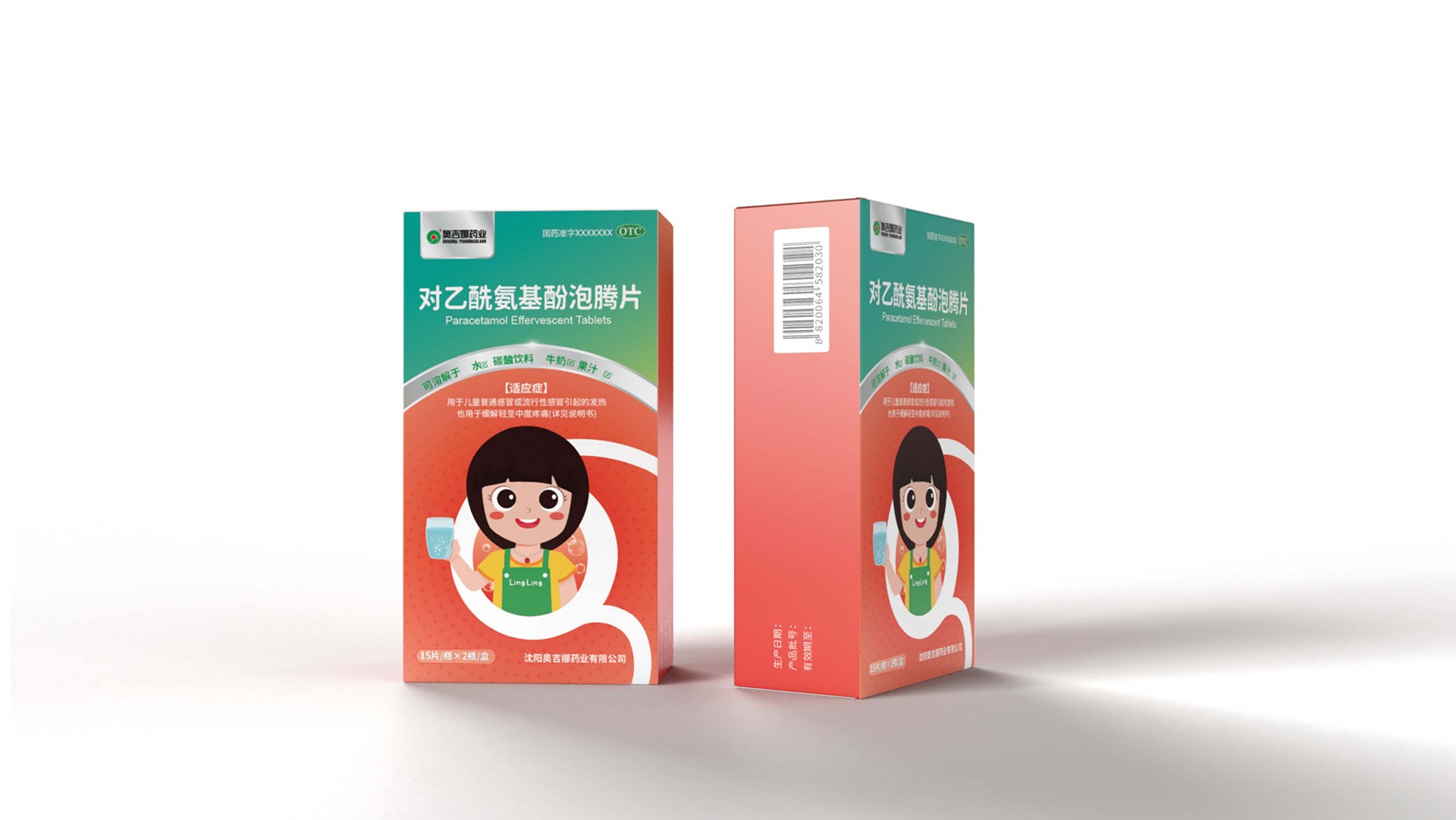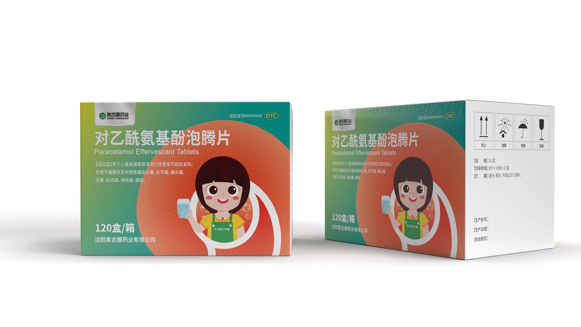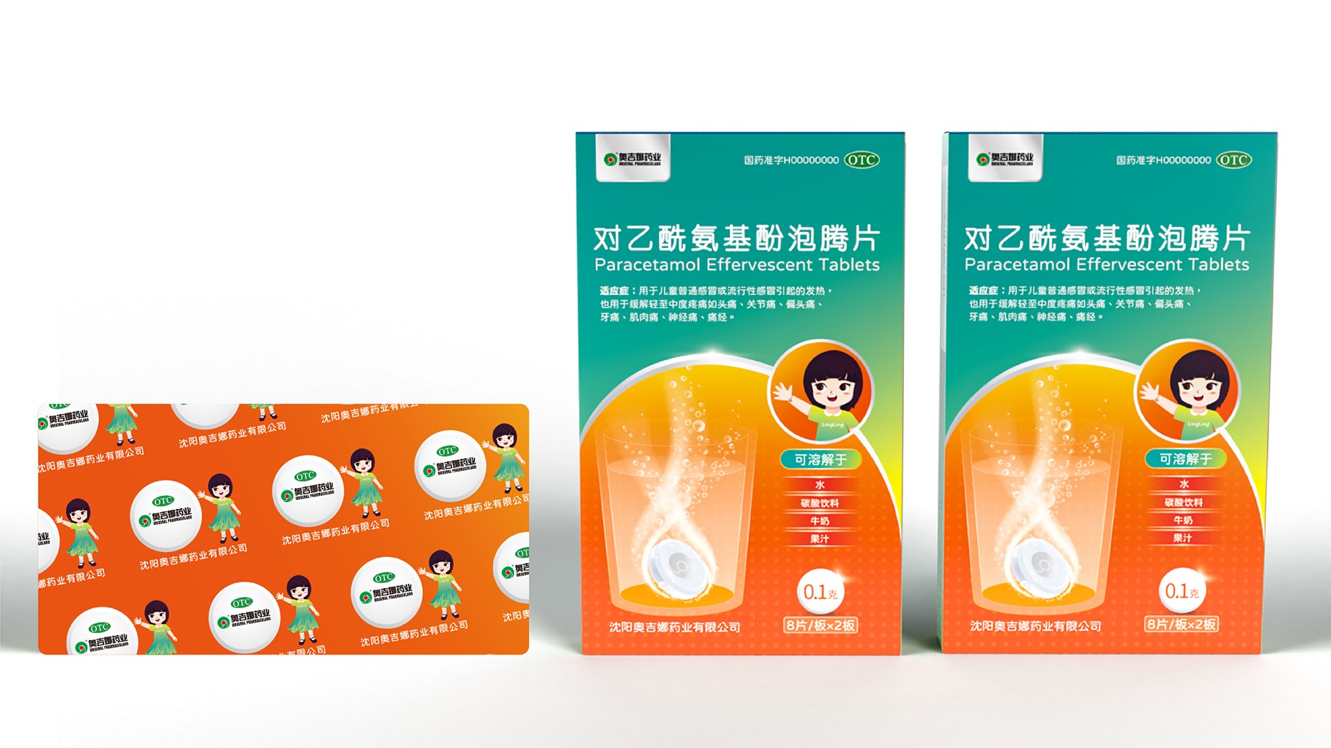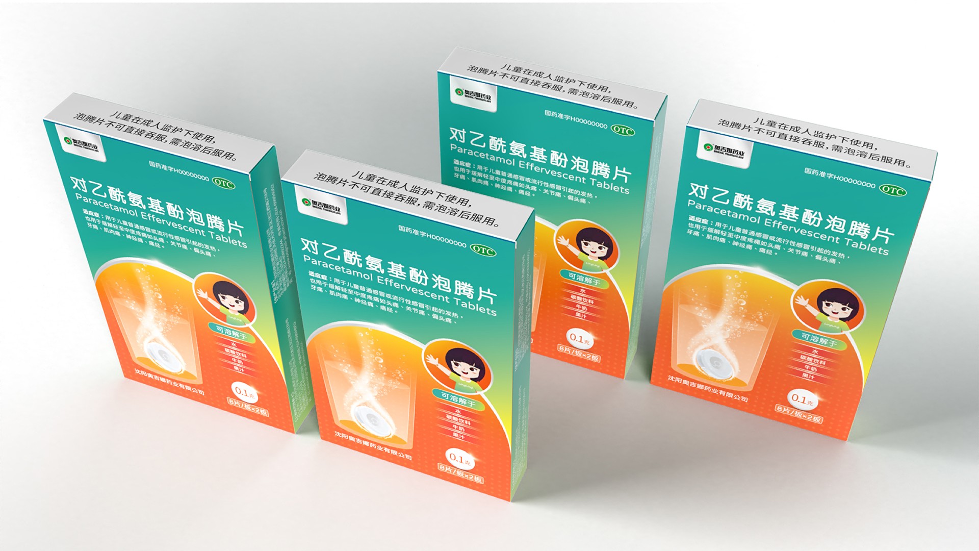 石特廣告在為對乙酰氨基酚泡騰片設計包裝時,從藥品形態、產品使用人群等方面思考主畫面設計。泡騰片浸入液體,發生泡騰反應狀如沸騰,主畫面描繪藥物揮發形態,展現溶于液體的特性,畫面生動且具趣味性,能夠吸引目標使用人群(兒童)。在色彩設計上,考慮到色彩本身特性以及藥品相關使用規則,設計師將藍綠漸變結合橙黃漸變,作為包裝主要顏色,藍色與綠色本身有著健康、活力的含義;橙黃由深到淺的過程中融入粒子元素,有退熱之意,很好展現了產品的功能屬性。
