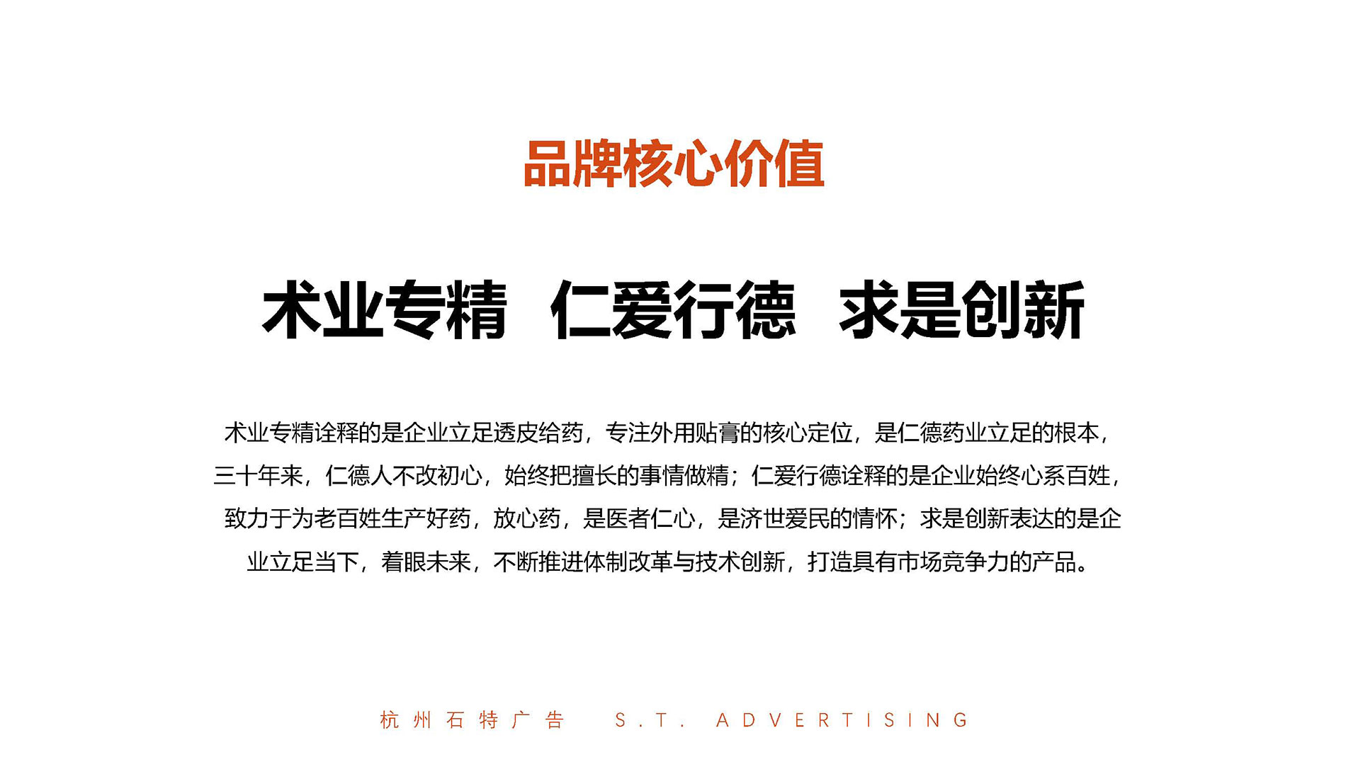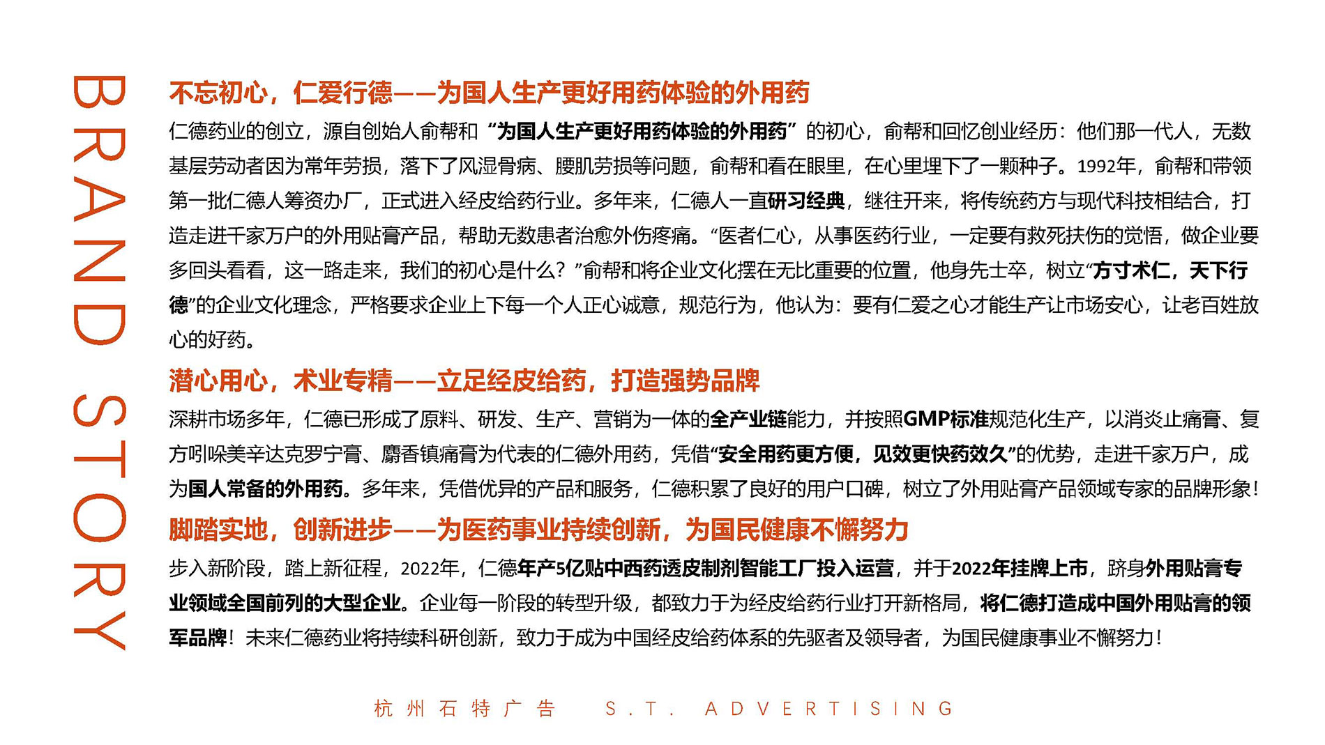 仁德藥業(yè)一直以經(jīng)皮給藥立足,是杭州乃至全國較大規(guī)模的外用透皮貼劑企業(yè),企業(yè)成立三十年之際,仁德開工建設年產(chǎn)5億貼中西藥透皮制劑智能工廠并籌備上市。在大力推動市場布局的同時,原有的品牌定位不精準;品牌理念與價值不成體系;品牌形象陳舊、不規(guī)范;產(chǎn)品系列待規(guī)劃,包裝形態(tài)落后,亟待自上而下為品牌打好根基,提高產(chǎn)品市場行銷力。