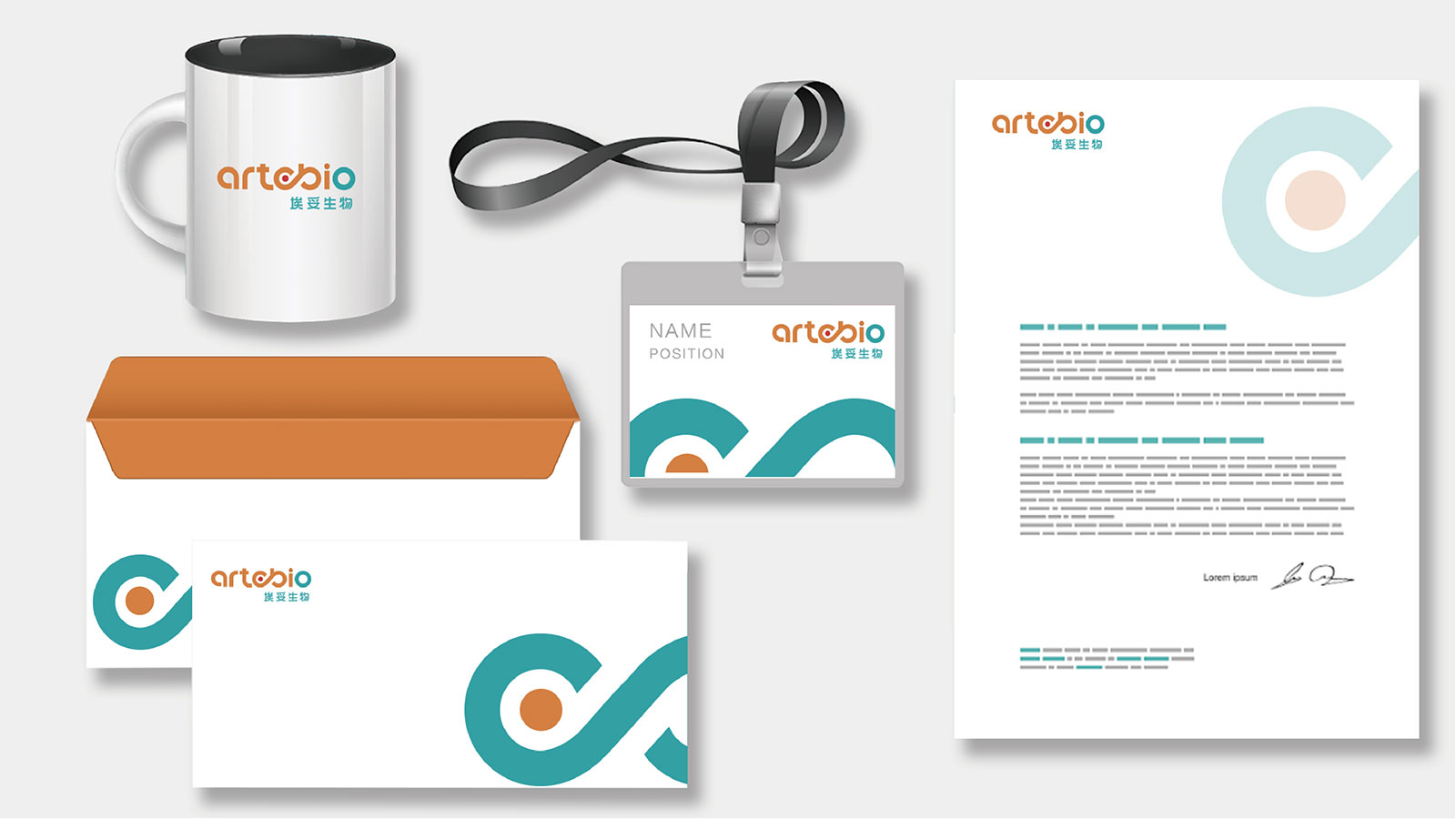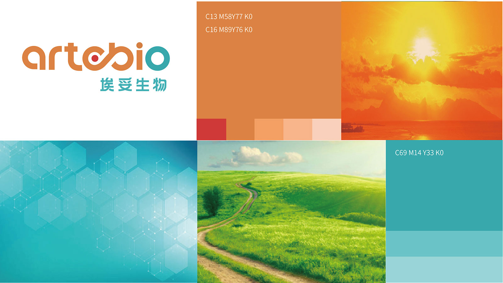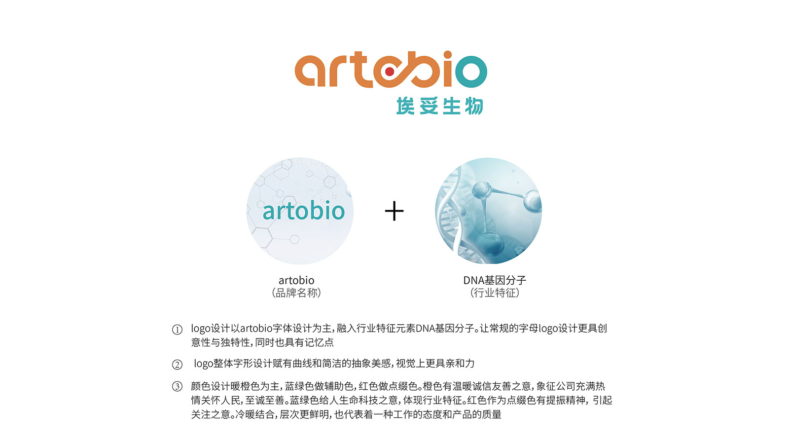 logo設計以artobio字體設計為主,融入行業(yè)特征元素DNA基因分子,讓常規(guī)的字母logo設計更具創(chuàng)意性與獨特性,同時也具有記憶點。logo整體字形設計賦有曲線和簡潔的抽象美感,視覺上更具親和力,顏色設計?色為主,藍綠色做輔助色,紅色做點綴色。橙色有溫?誠信友善之意,象征公司充滿熱情關懷人民,至誠至善。藍綠色給人生命科技之意,體現(xiàn)行業(yè)特征。
