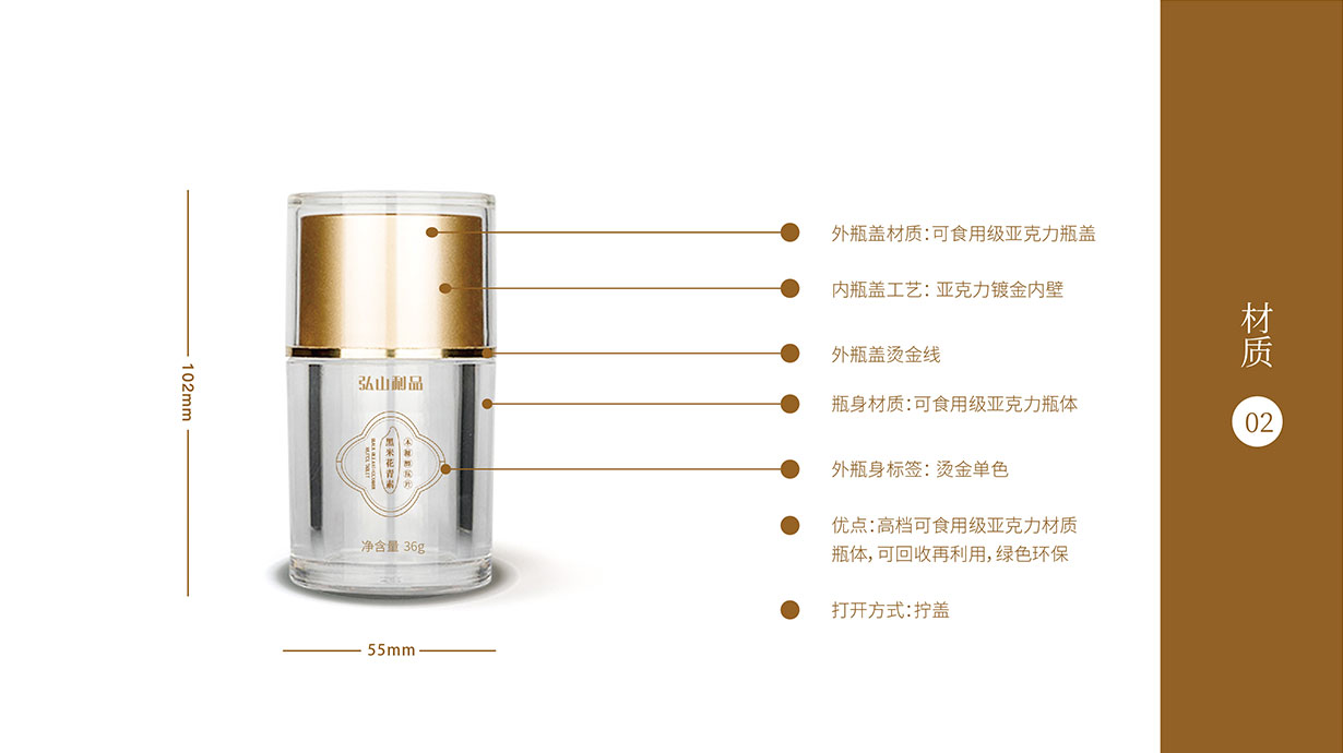 首先內盒采用透明食用級亞克力瓶身,對品牌獨有標牌和弘山利品品牌標簽進行設計,黑米+花的形狀,結合黑米的黑,體現“米中黑珍珠”的營養價值;再用金色,其一含義是黑米稻穗的顏色,體現天然無添加的自然感受;其二含義是黑米花青素是色素之精品,體現其高貴地位。通過包裝升級統一形象后,深化了弘山禮品在用戶心中的外在形象,品類包裝問題得以解決。