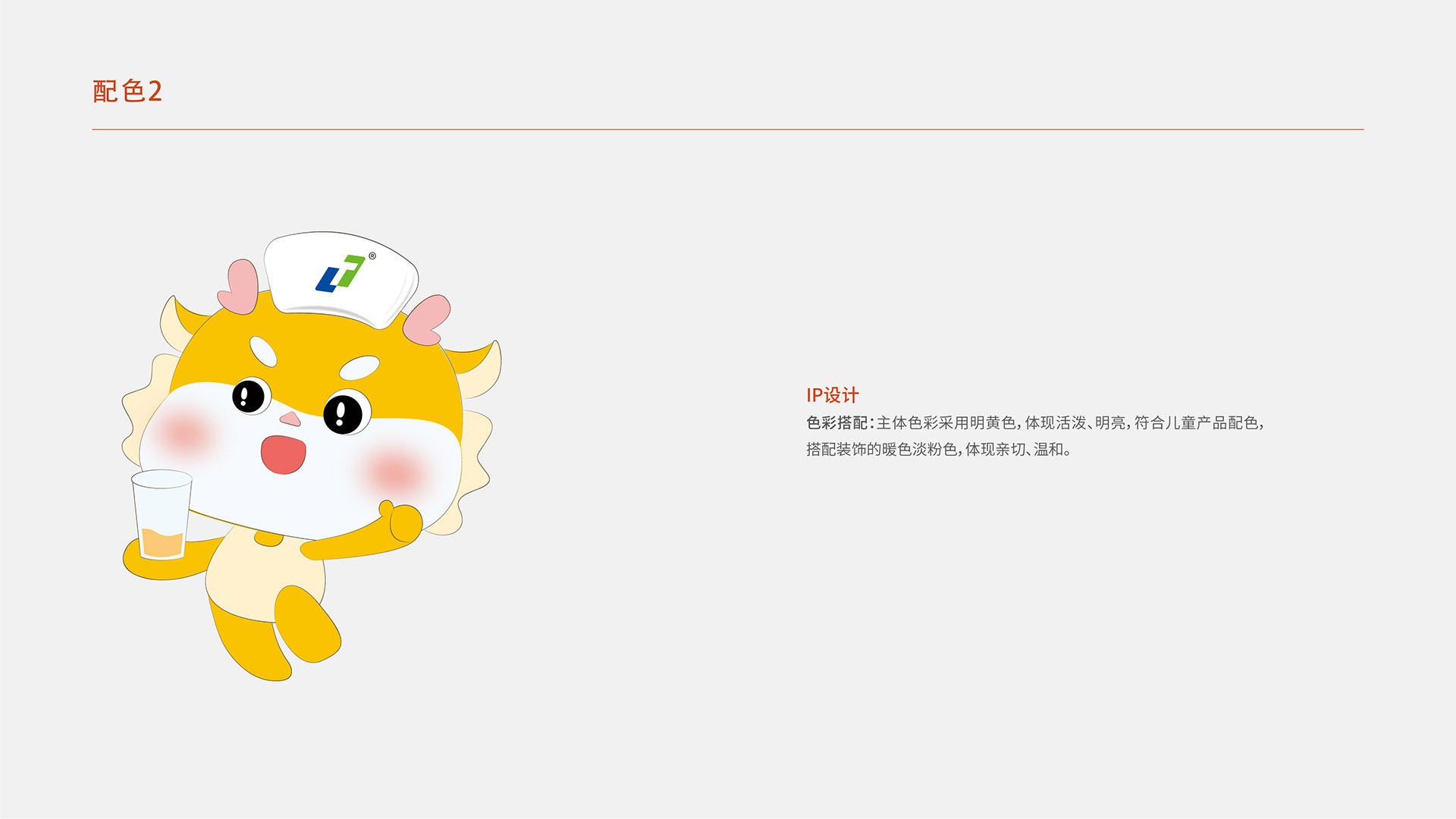 IP形象設定:左圖的ip是小龍形象,龍在中國傳統文化中,是幸運和成功的象征,也象征健康,是一種傳承不息的精神。左圖的龍仔頭戴護士帽,體現行業屬性,兩個龍角似愛心,表現人文關懷。龍仔整體為兩頭身,可愛的大腦袋,體現差異化的同時,展現可愛親切。右手豎起大拇指表示稱贊,左手托起產品,可以根據不同產品進行變換。護士帽上印著log0,突出品牌標識。色彩搭配:主體色彩采用淡藍色,體現行業屬性,表現高效、專業。搭配裝飾的暖色淡粉色,表現兒童產品,體現親切、溫和。