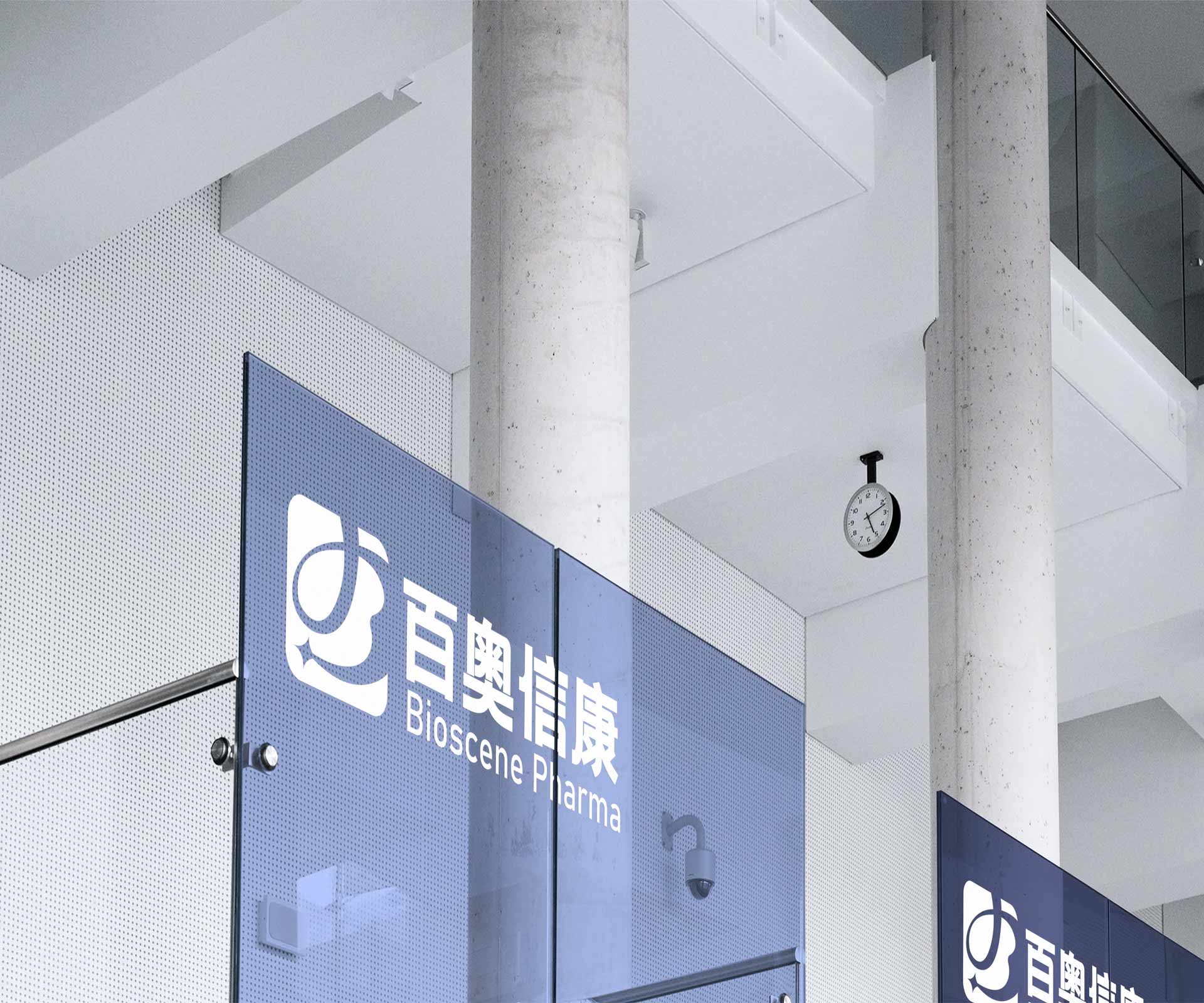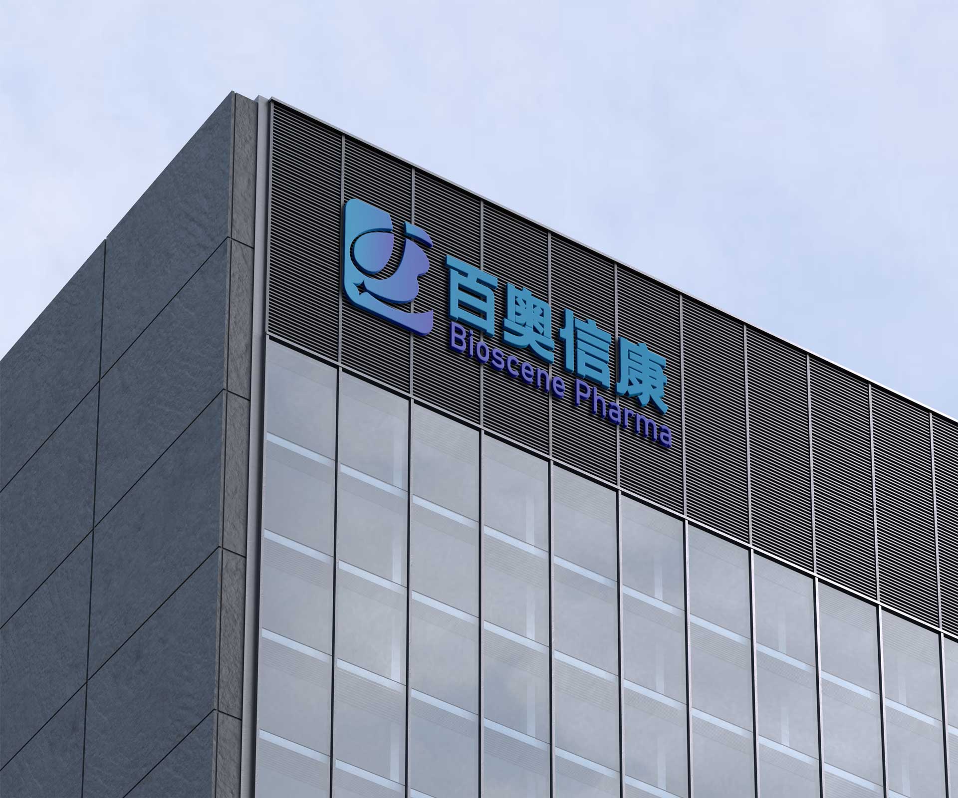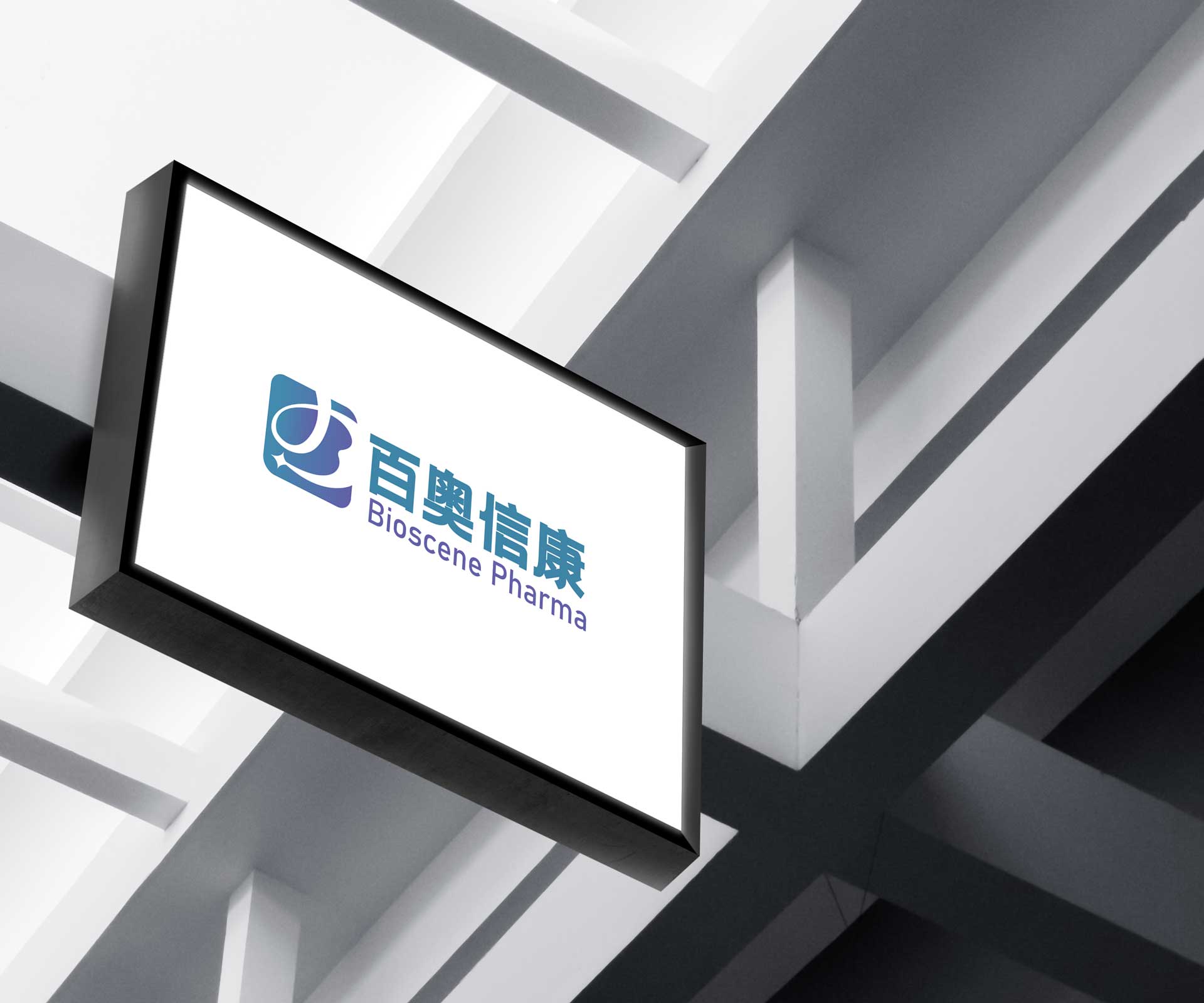 中英文品牌名稱“百奧信康”與“Bioscene Pharma”以專業(yè)字體搭配,清晰易讀,強化品牌識別。