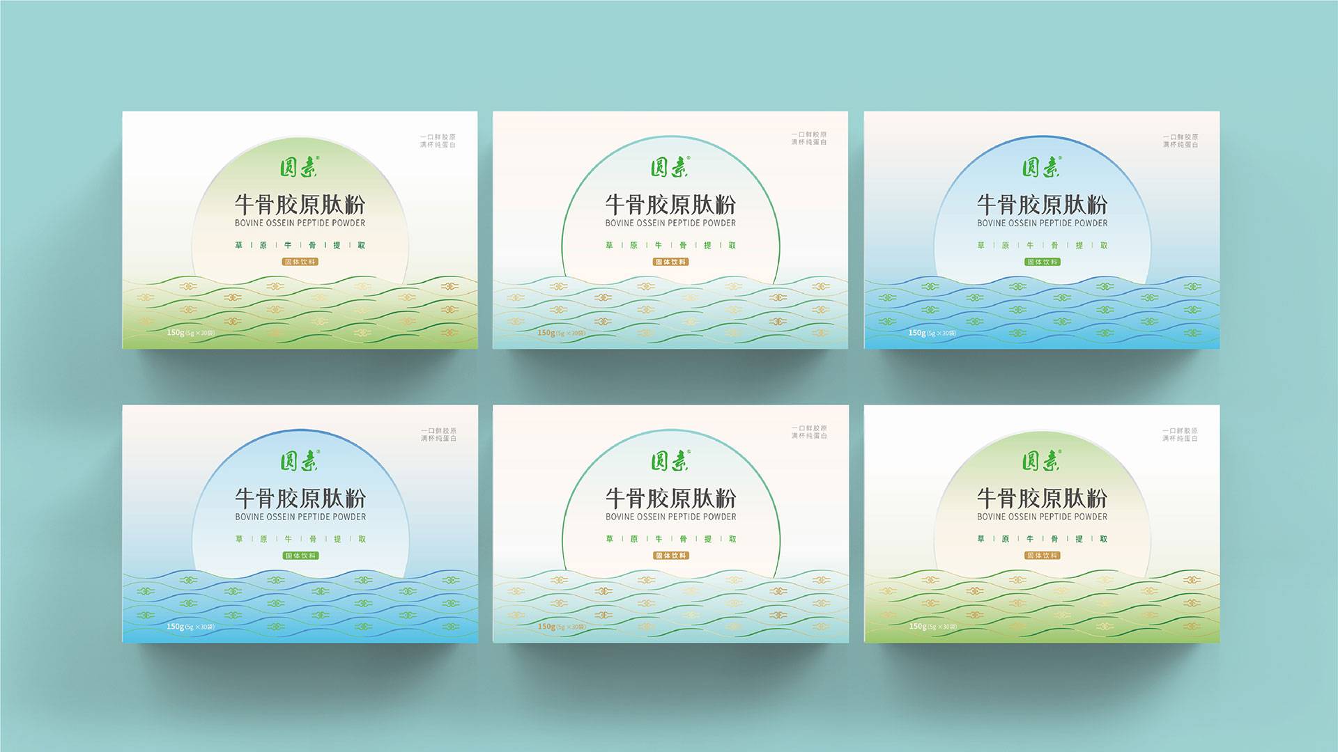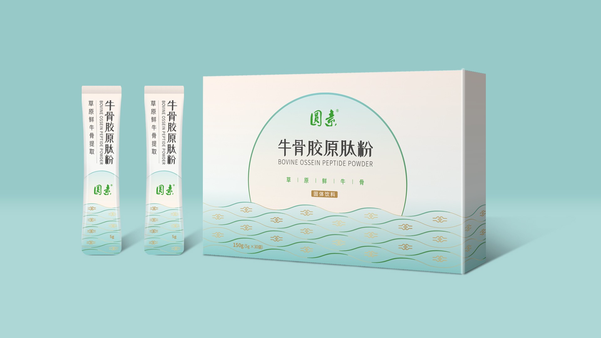 在著手“圓素”牛骨膠原肽粉的包裝設計時,石特前期做足了充分的調研,我們了解到該產品以草原牛骨為原料,具有分子量小、純度高、水溶性好的特性,地域性特征十分明顯,