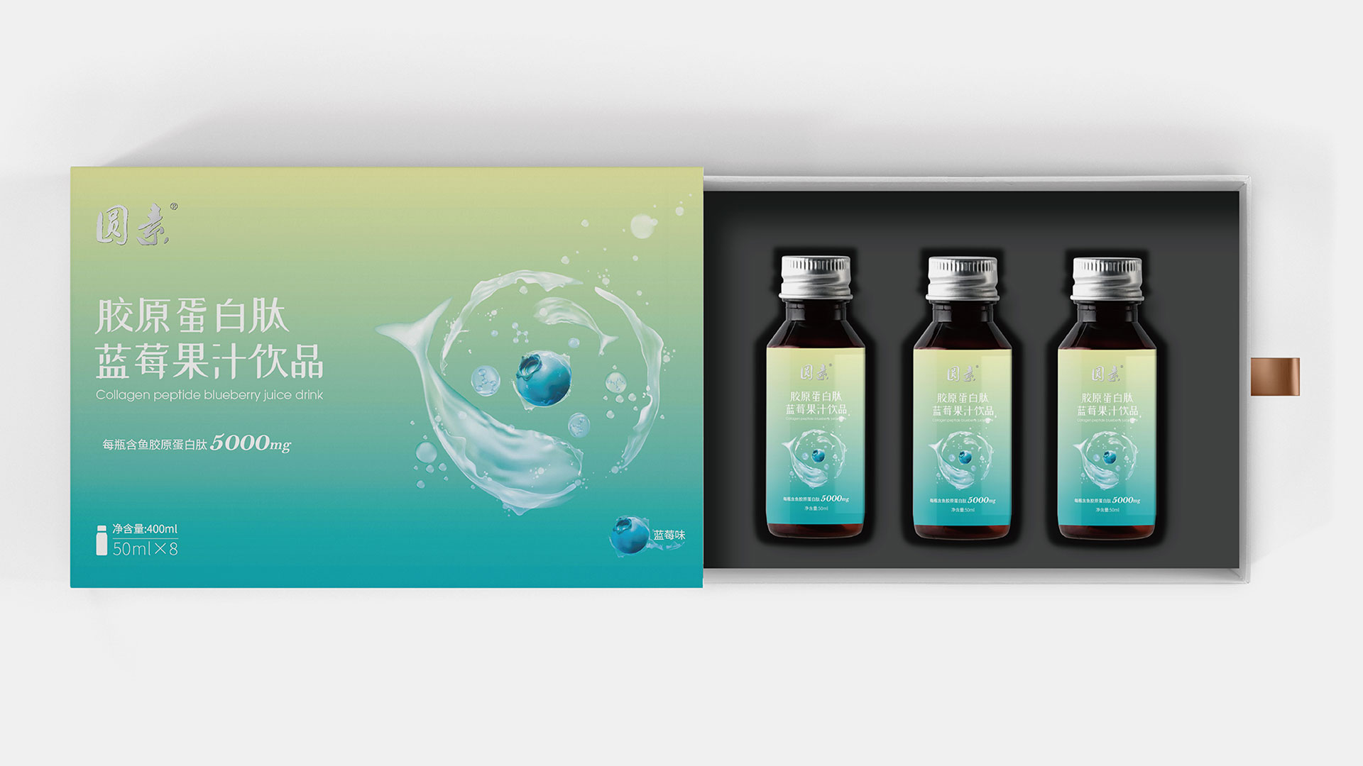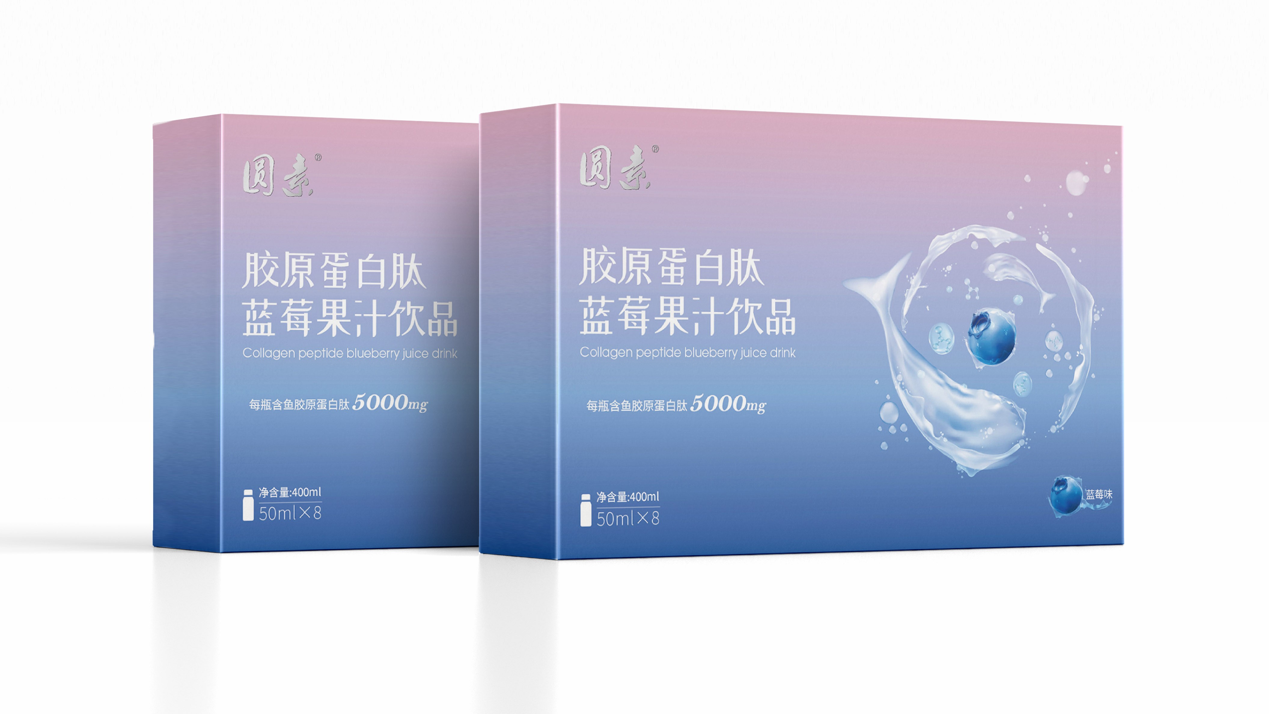 為能更好的突出產品特性及核心賣點,我們圍繞"果汁、藍莓、魚膠原蛋白肽......"等相關元素,提出了全新的包裝設計方案:這款包裝以深海魚群環游在藍莓四周為主畫面,