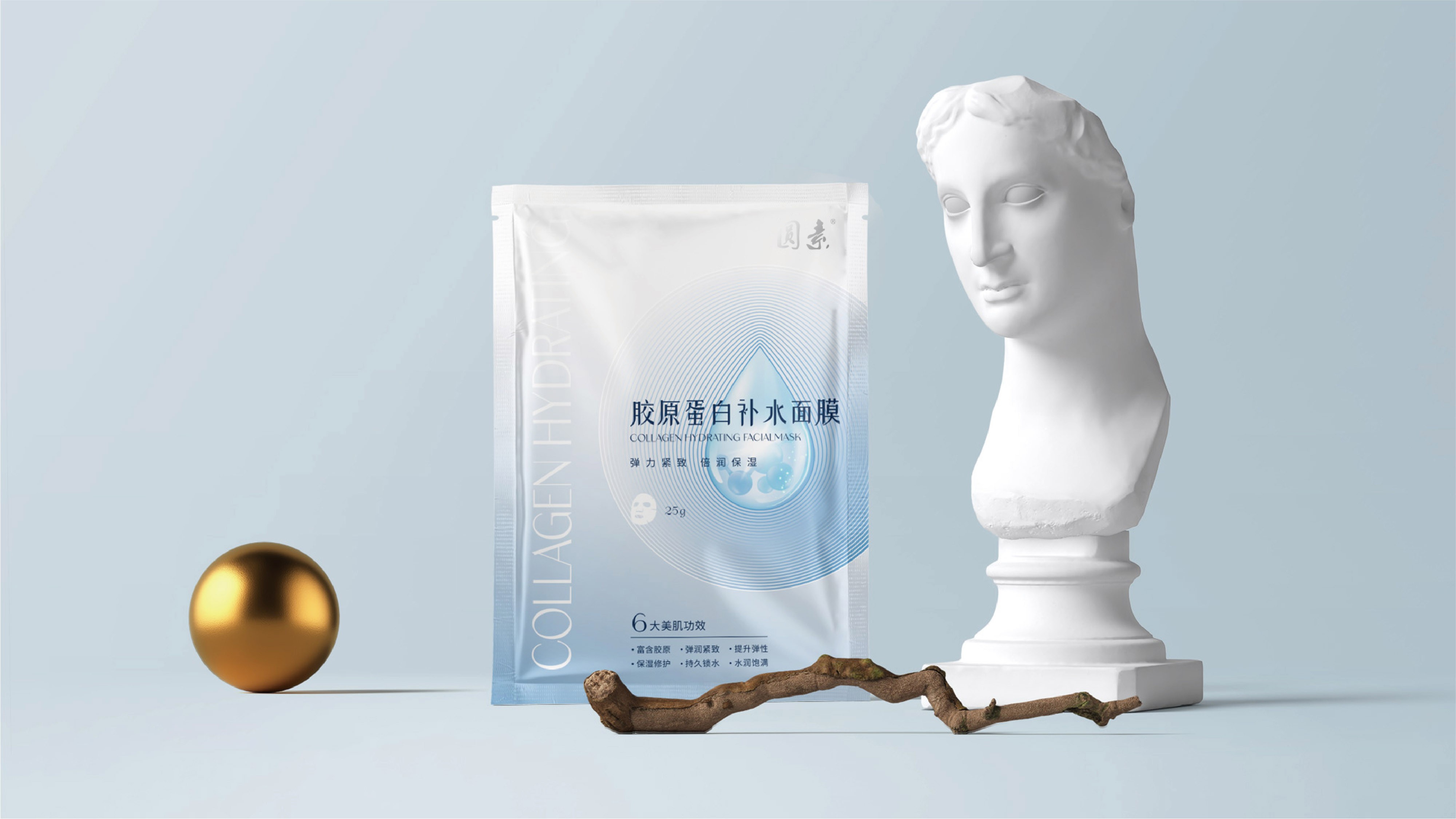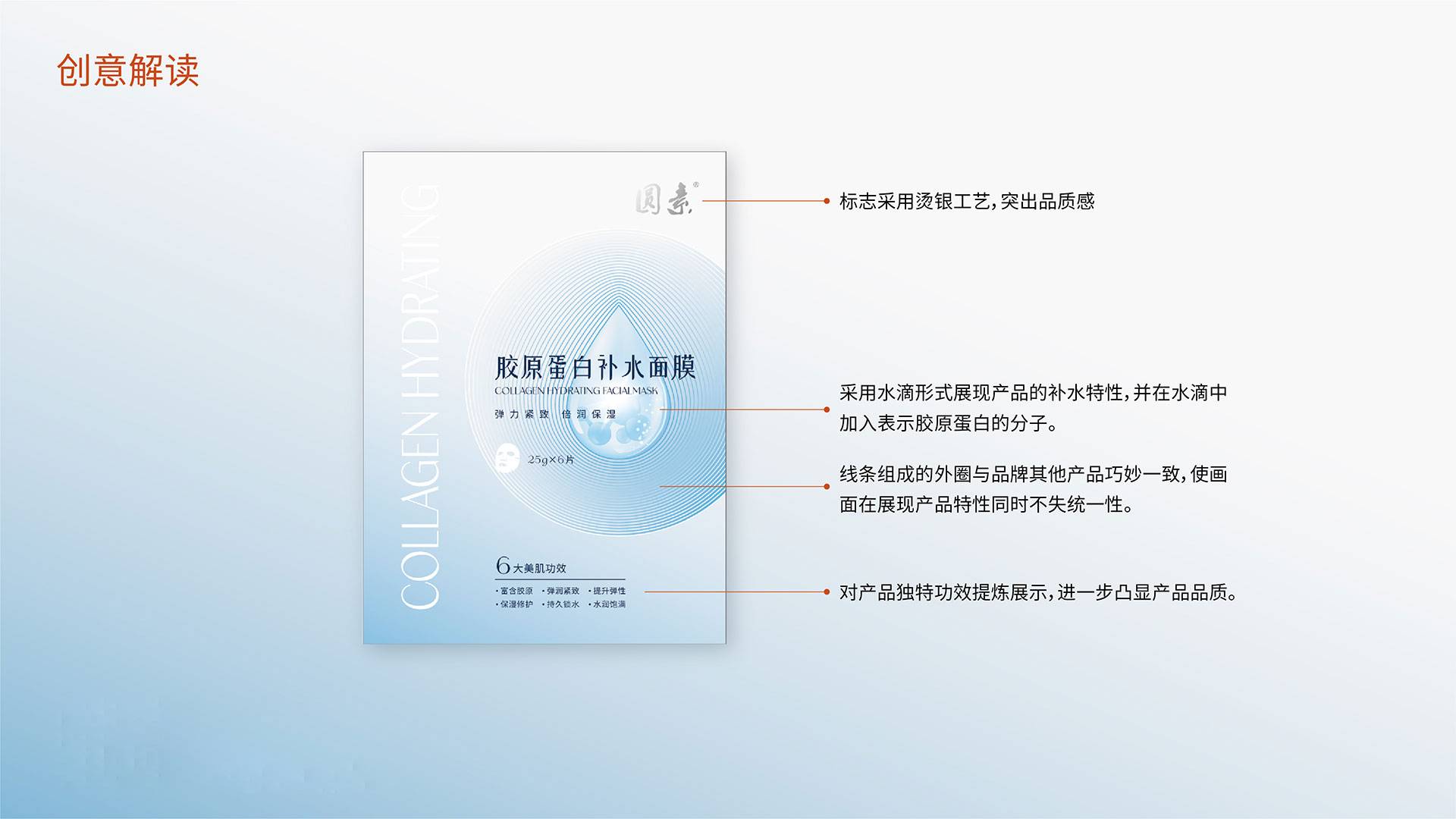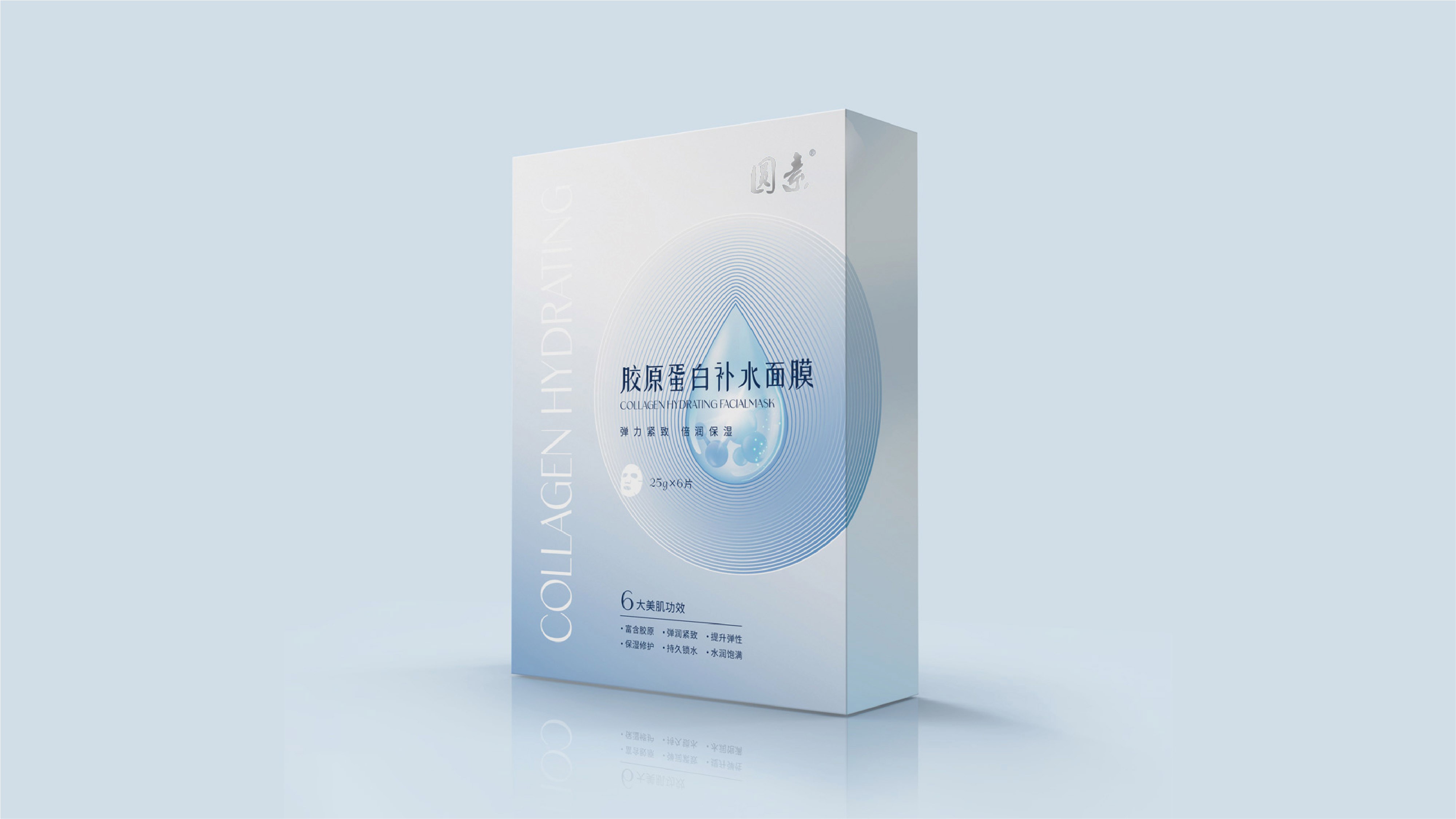 經過前期的調研及分析,石特了解到該款產品甄選優質膠原蛋白精華,具有補水鎖水等功效,基于此,我們提出了新的包裝創意:面膜的包裝在突出產品通用名的同時,將透亮的水滴作為主畫面,在水滴之中融入膠原蛋白分子,進而凸顯面膜補水鎖水的特性;包裝選用淡藍、白為主色調,整體設計簡約,給人清爽,潔凈的感覺。